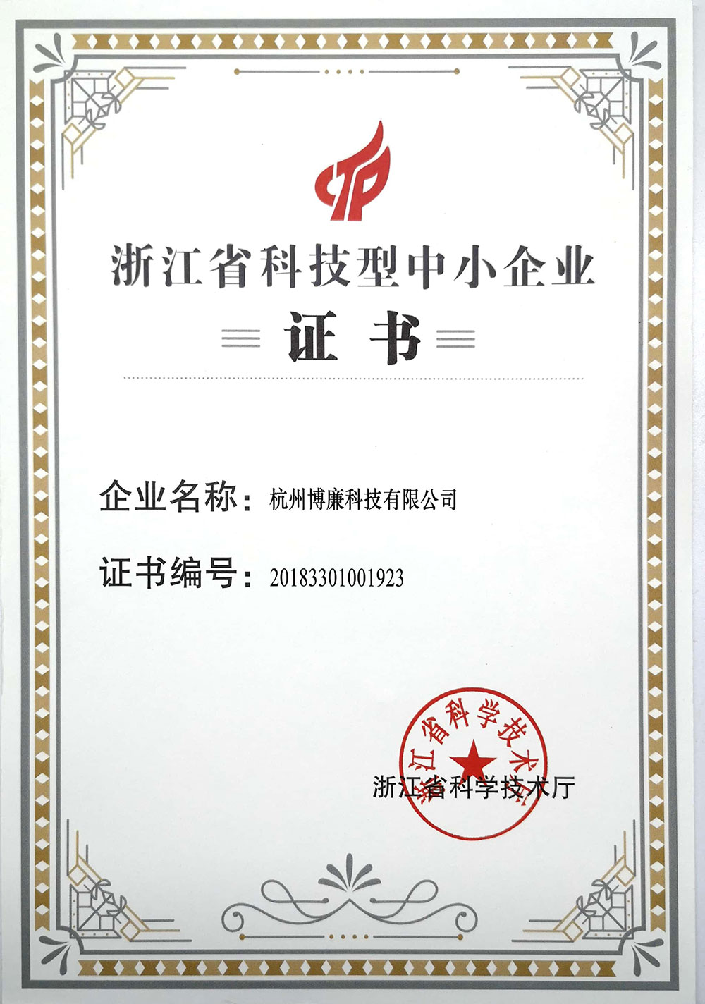 浙江省科技型中小企业证书